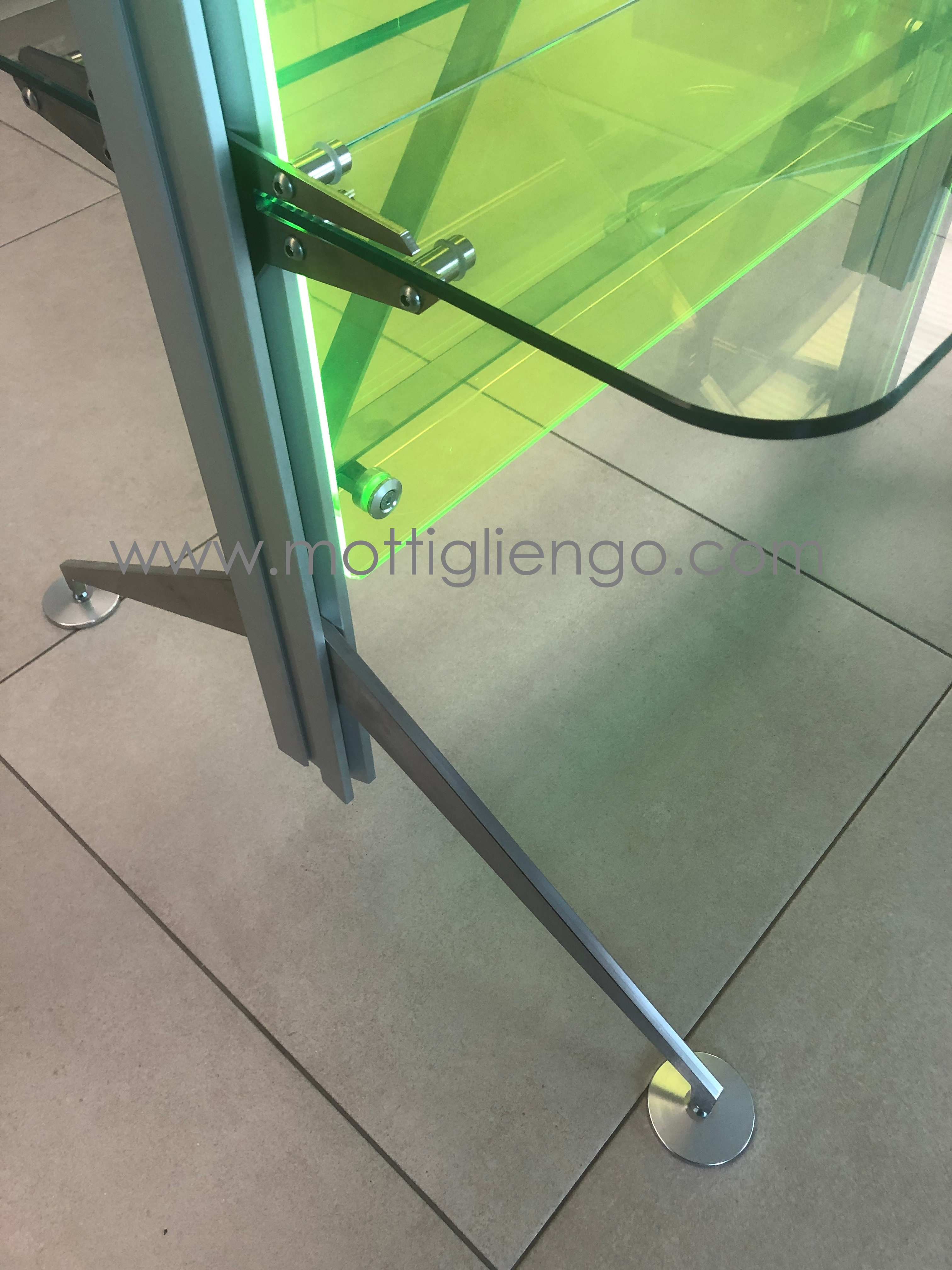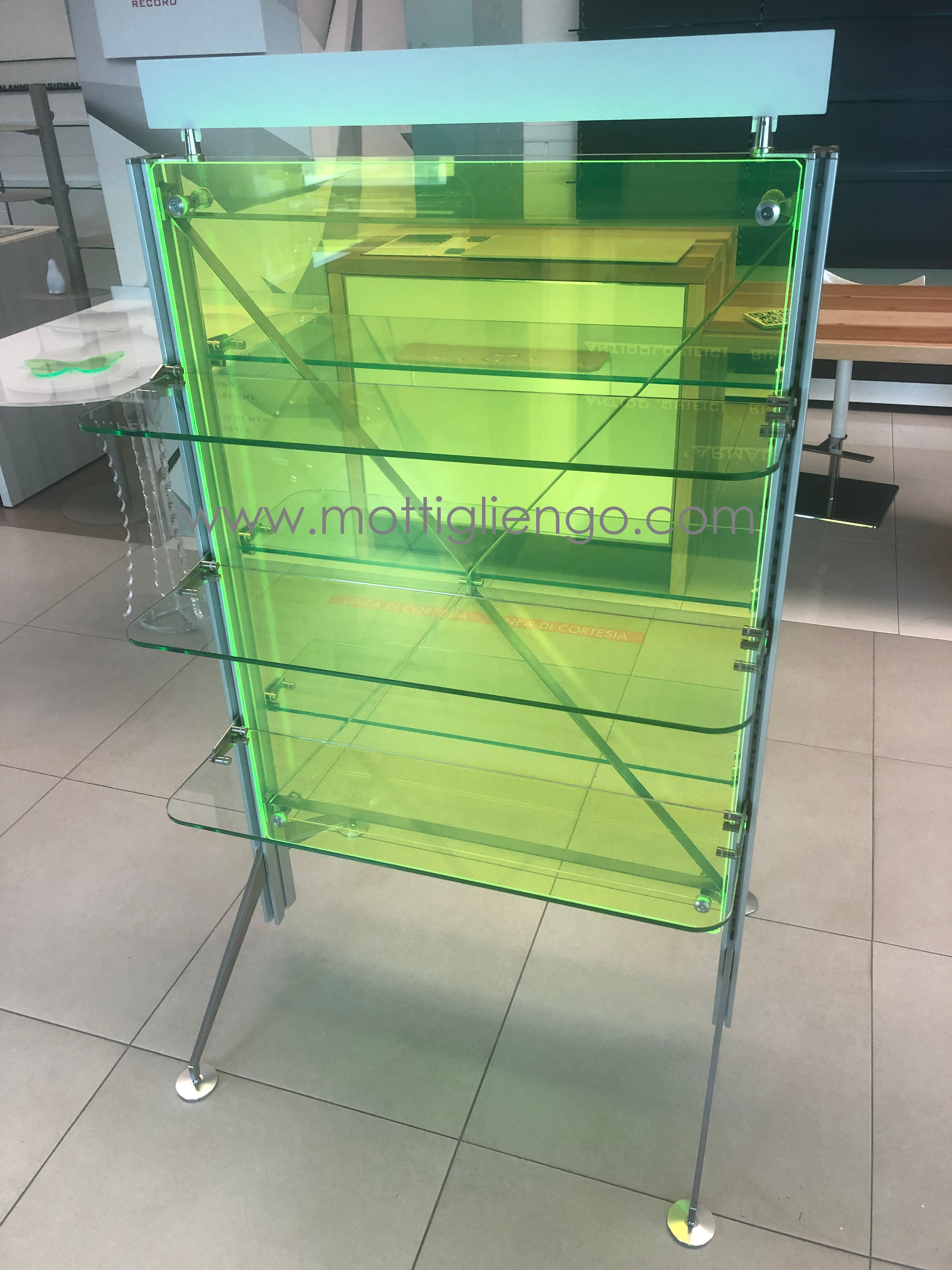 Mottigliengo presenta la nuova gondola high-tech con schienale in plexi fluo, disponibile in vari colori, struttura in alluminio anodizzato, ripiani in vetro trasparente o satinato e possibilità di integrare accessori per la comunicazione .